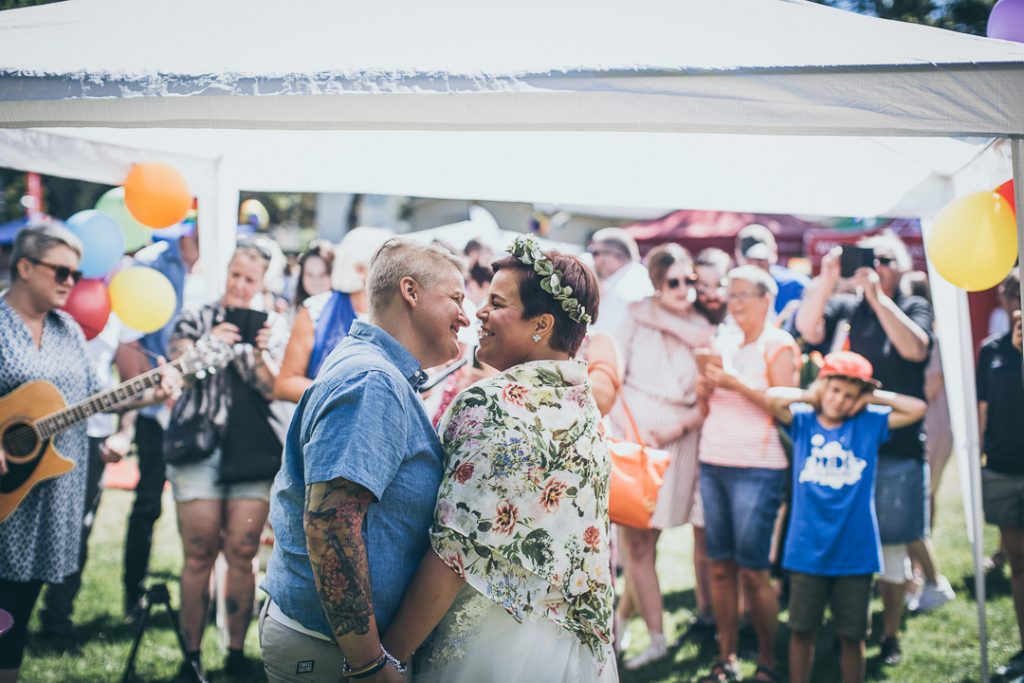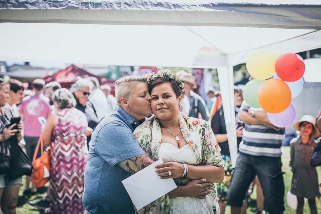 När min vän Anna berättade att hon träffat en tjej var jag svinsnabb med att paxa bröllopsfotograferingen. Anna bara skrattade och sa ”det ska du få, men det kommer dröja lääänge.” Jo, jo. Ett halvår senare stod de i Pride-parken och sa ja till varann. Och jag som hade tjatat om att få fota bröllopet fick så att säga step up my game och kombinera arrangerande av Pride-festival med bröllopsfotografering. Häpp. Allt går, om en vill tillräckligt mycket. Och jag ville.