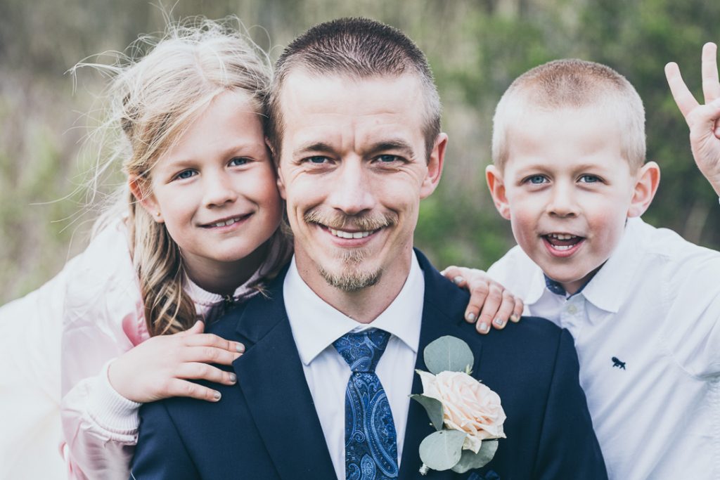 Vid vår planeringsträff hade vi bestämt oss för att porträttfotograferingen skulle ske efter själva vigseln och Linda och Micke hade valt ett ställe vid havet där vi både fick vara lite ifred, men där också kunde få fina typiska Varbergsmotiv med. Vi började med att fota tillsammans med deras fina barn – Elin, Albin och Linnea.